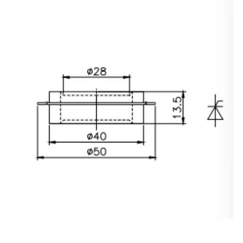 The KK200A 4-10 Fast Turn-Off Thyristor is a high-performance semiconductor device designed for fast switching power control applications. It features an interdigitated amplifying gate, high di/dt capability, and low switching loss, making it suitable for demanding industrial circuits. This model offers an average on-state current of 200A, repetitive peak off-state/reverse voltage from 800V to 1600V, surge current up to 2.5kA, and turn-off time of 16–35μs. It is built in a disc-type package with double-side cooling, helping improve thermal performance and reliability in converter, chopper, and induction heating systems. According to the outline drawing, the device has an approximate 50 mm outer diameter, 40 mm body diameter, 28 mm upper contact area, and 13.5 mm height.
