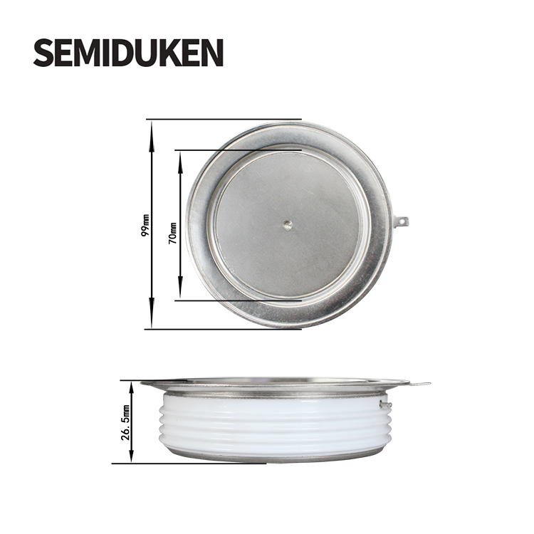 The DKT2500A is a high-performance Phase Control Thyristor designed for large power converters, DC and AC switches, and both active and passive inverters. It features a robust metal case with a ceramic insulator, offering low on-state and switching losses. This thyristor can handle large currents and high voltages, making it ideal for heavy-duty applications where reliability and power management are critical. It is specifically engineered for efficiency in large-scale electrical systems.