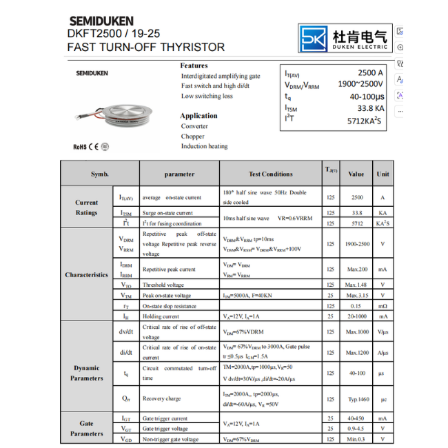 The DKFT2500A / 19-25 Fast Turn-Off Thyristor is a high-power disc-type semiconductor device designed for industrial power switching and control applications. It features an interdigitated amplifying gate, fast switching capability, high di/dt performance, and low switching loss for demanding power systems. With an average on-state current of 2500A and a repetitive peak off-state/reverse voltage range of 1900V to 2500V, this thyristor is well suited for converters, chopper circuits, and induction heating equipment. Its double-side cooled clamping structure provides efficient heat dissipation and reliable operation in high-current assemblies.